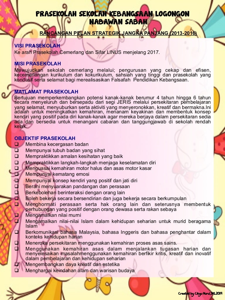 PRASEKOLAH SEKOLAH KEBANGSAAN LOGONGON NABAWAN SABAH RANCANGAN PELAN STRATEGIK JANGKA PANJANG 2013-2016 VISI PRASEKOLAH Ke arah Prasekolah Cemerlang dan Sifar LINUS menjelang 2017. Program Objektif Tanggungjawab Tempoh Kos Sumber Indikator Pencapaian TOV. Tentang perancangan pihak pengurusan sekolah untuk.